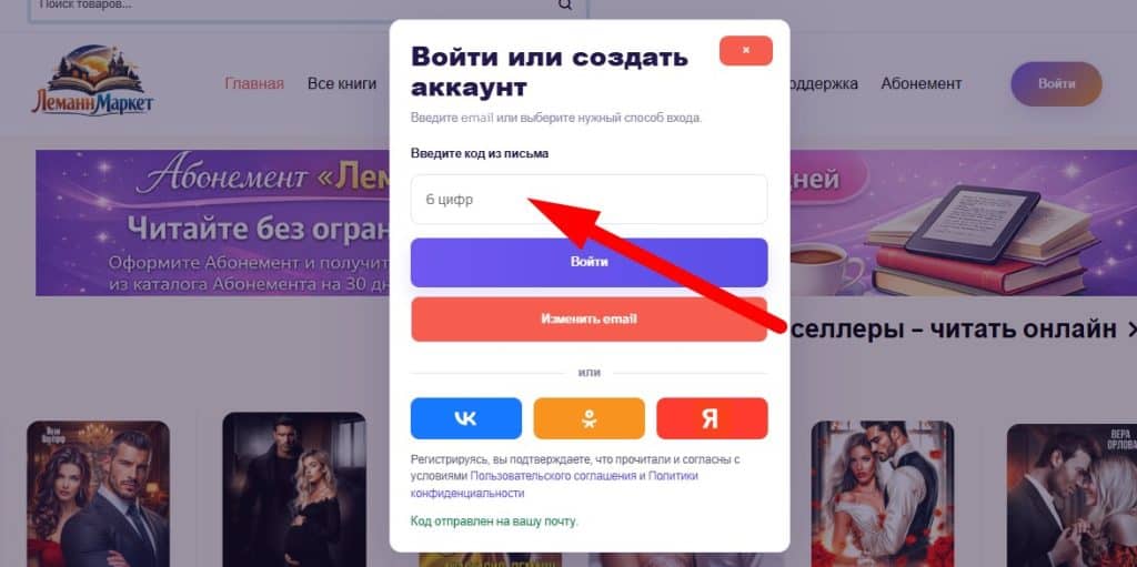 5. Откройте вашу почту — вам придёт письмо от Леманн Маркет с 6-значным кодом